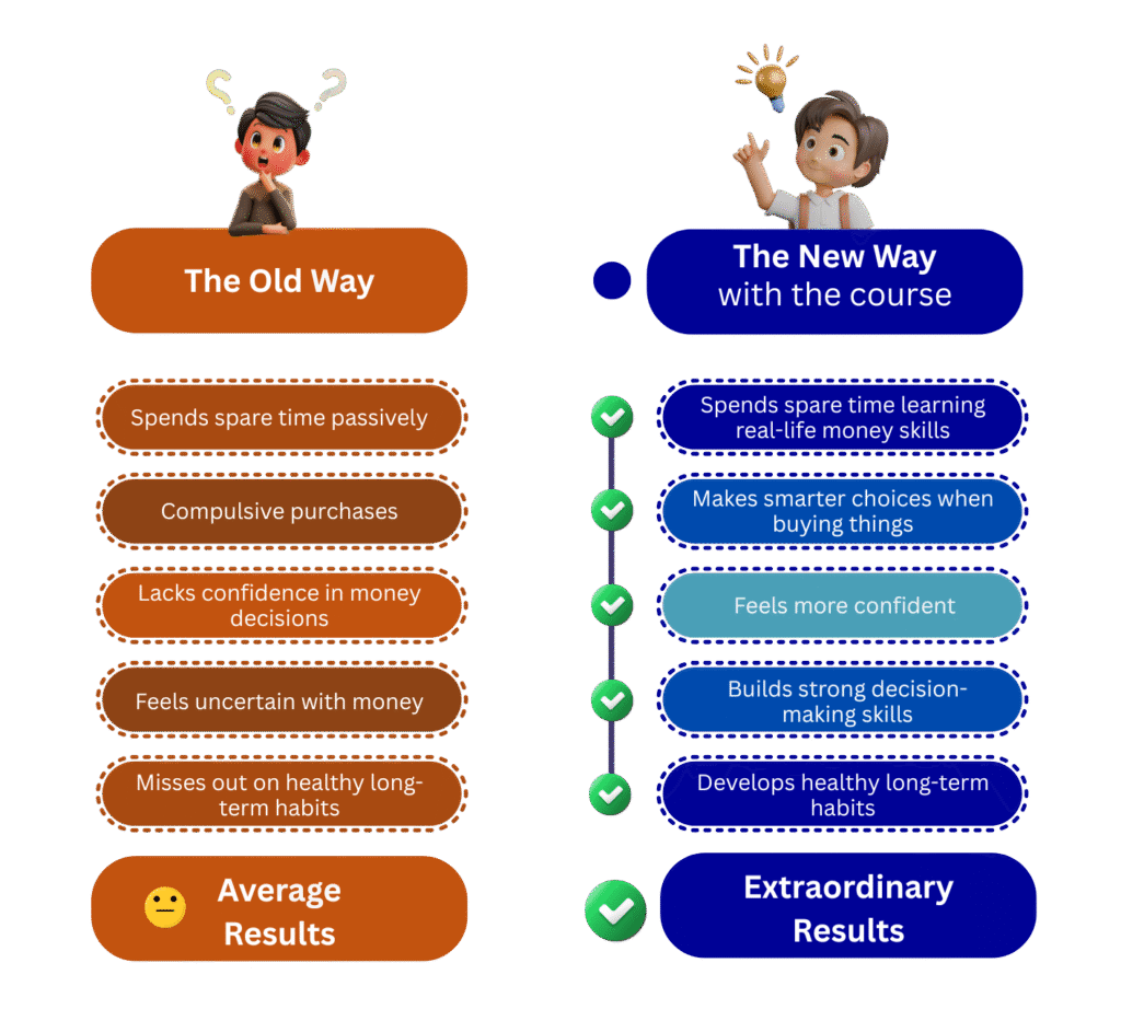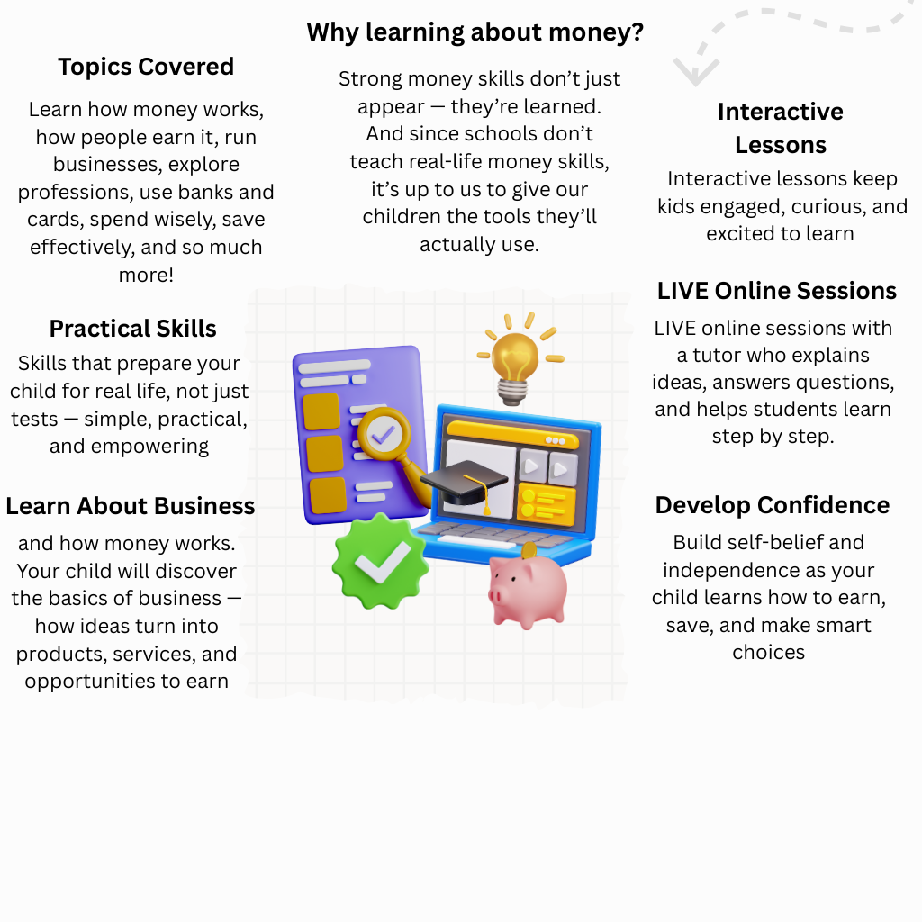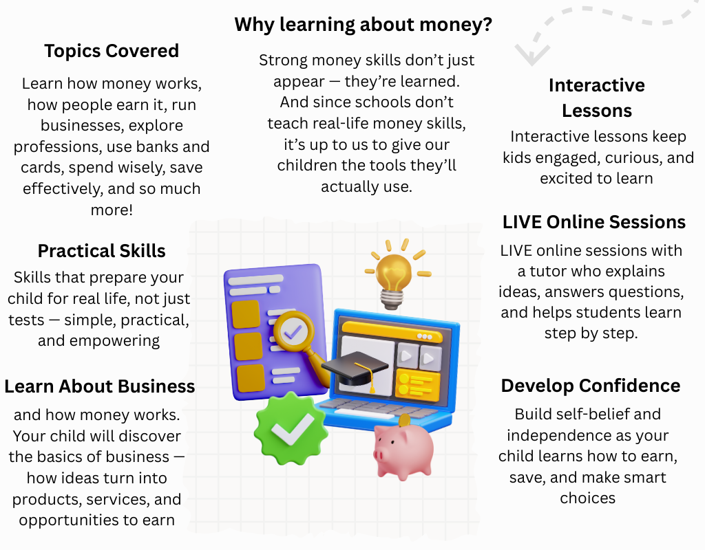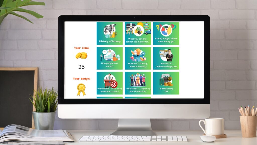 This program is primarily designed for children aged 8 to 13, as the lessons are tailored to match the understanding, interests, and learning style of this age group. However, the content is flexible and can also be beneficial for slightly younger children—especially those who are curious and enjoy learning through interactive activities—or older children who may not have been introduced to financial topics before.